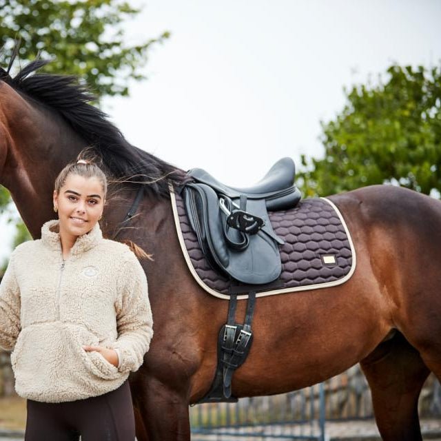 Die sechseckige Steppung der Rückseite verleiht dem Stoff sowohl Struktur als auch zusätzliche Festigkeit. Dadurch bleibt das Pad mit der Zeit in Form und bietet eine stabile Basis unter dem Sattel, was zu einer besseren Passform und mehr Komfort für das Pferd beiträgt.